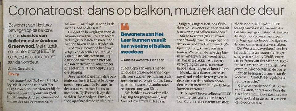 Reeshof Cultuurt en Theatercollectief EELT hebben de handen ineen geslagen om in deze onzekere tijd toch cultuur en vertier te brengen in de wijk.