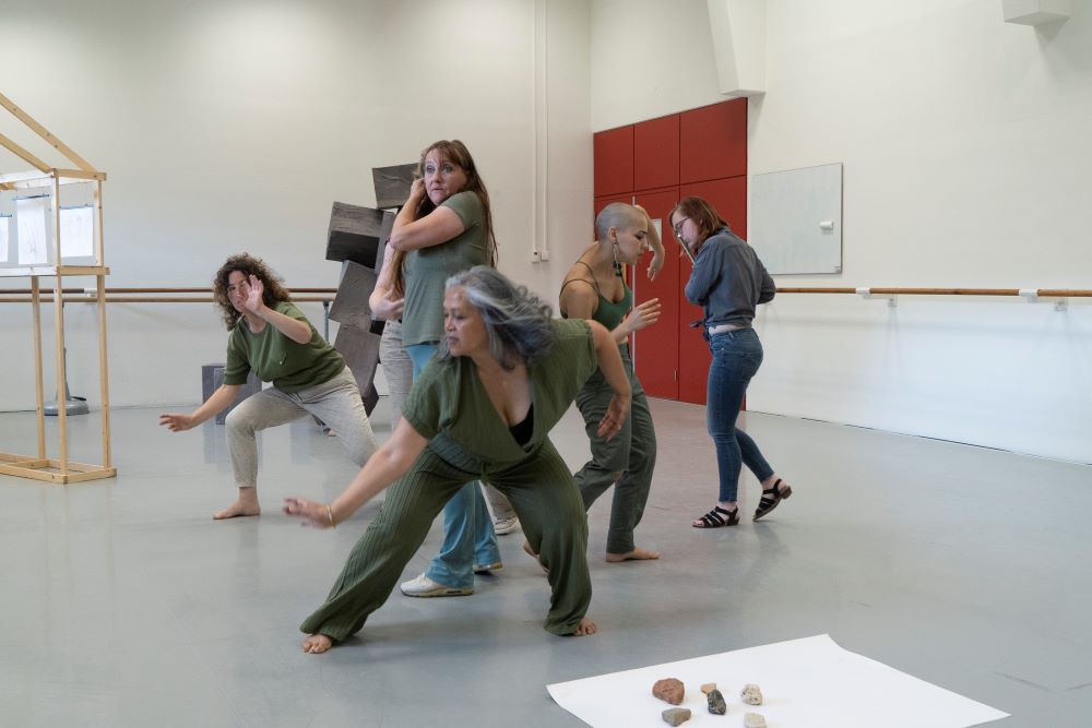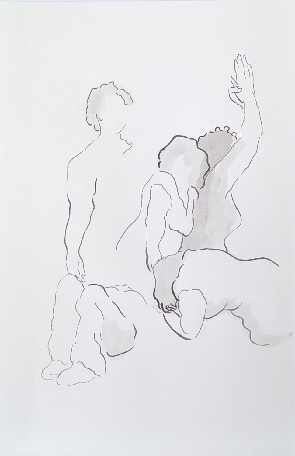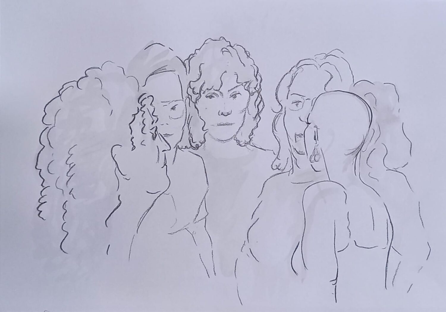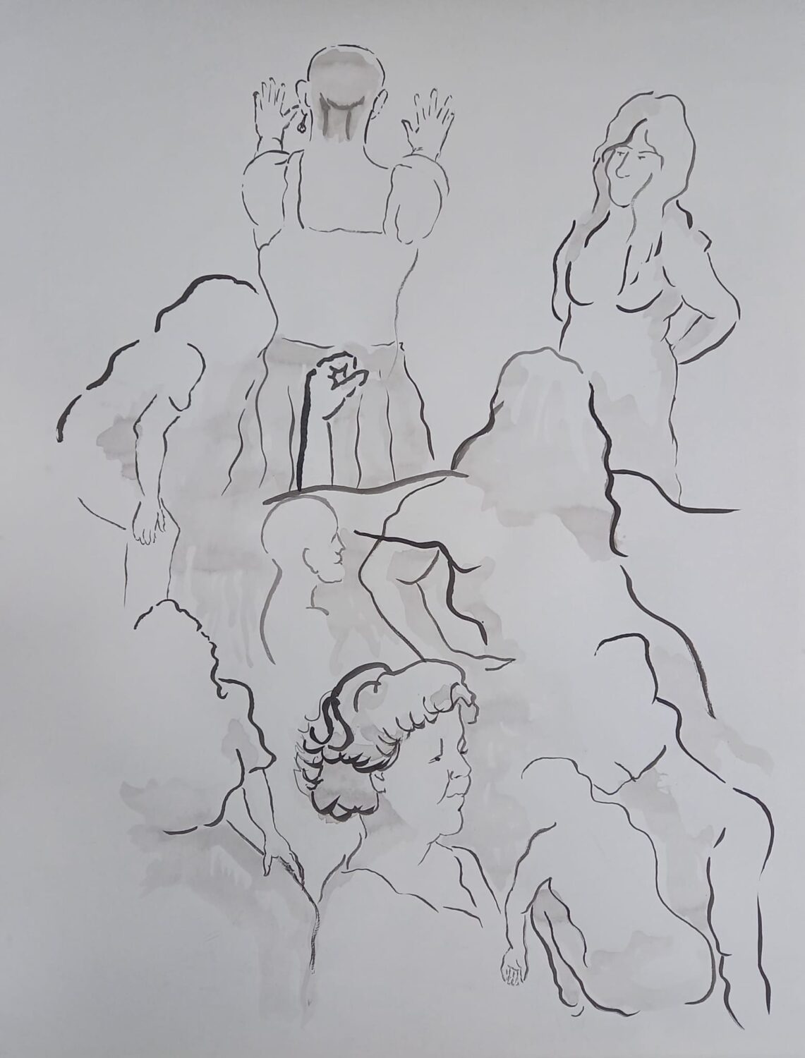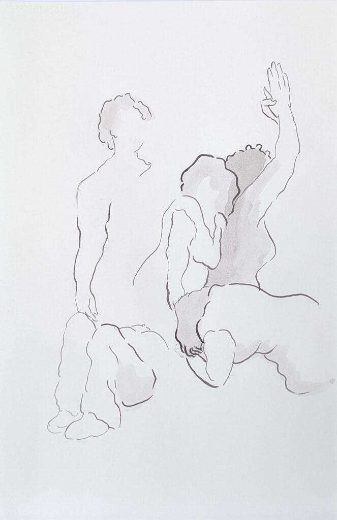 Kunstenares Margit Janssen legt de repetities live vast in tekeningen. “Ik teken wat ik waarneem. Dat doe ik snel vanuit de beweging. Ik vind ‘Als een rots’ een prachtig project waarin poëzie, muziek, beweging en tekenkunst samenkomen. In het begin kende niemand elkaar en nu is er volop contact. Aan het eind van elke repetitie gaat iedereen weer blij naar buiten. Ik zie de verbinding voor mijn ogen ontstaan, vrouwen die in hun kracht komen te staan. Het is een thema dat ik herken. Ik heb zelf een onstuimig verleden en voel me verbonden met de vrouwen, ik begrijp hen.”